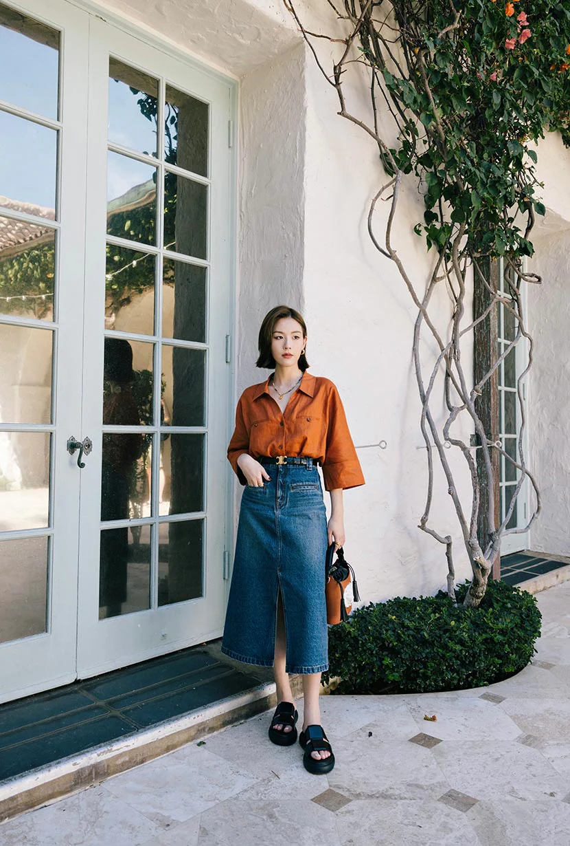 Description:A collaborative capsule collection with the modern muse @suggyl - Lightly faded for a perfect lived-in look and made using premium cotton. It sits on the natural waist, falls into midi length, and has a front slit.