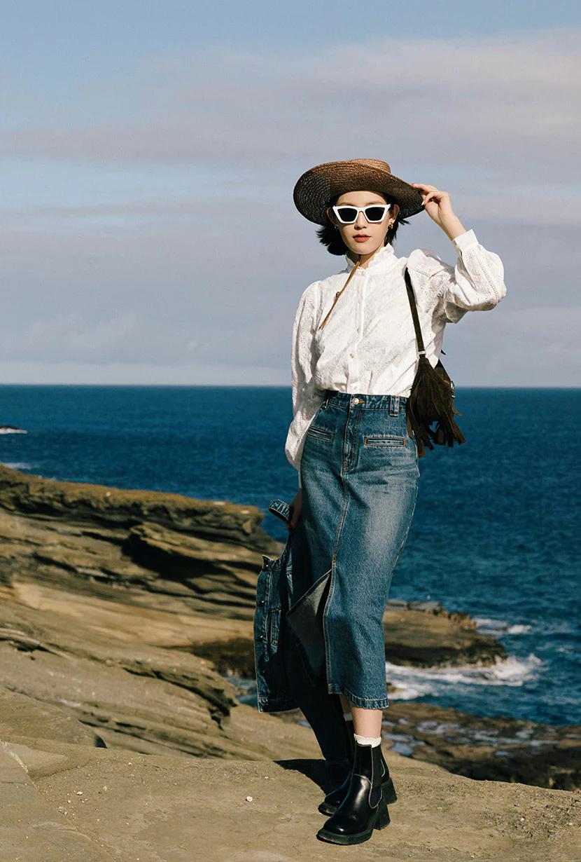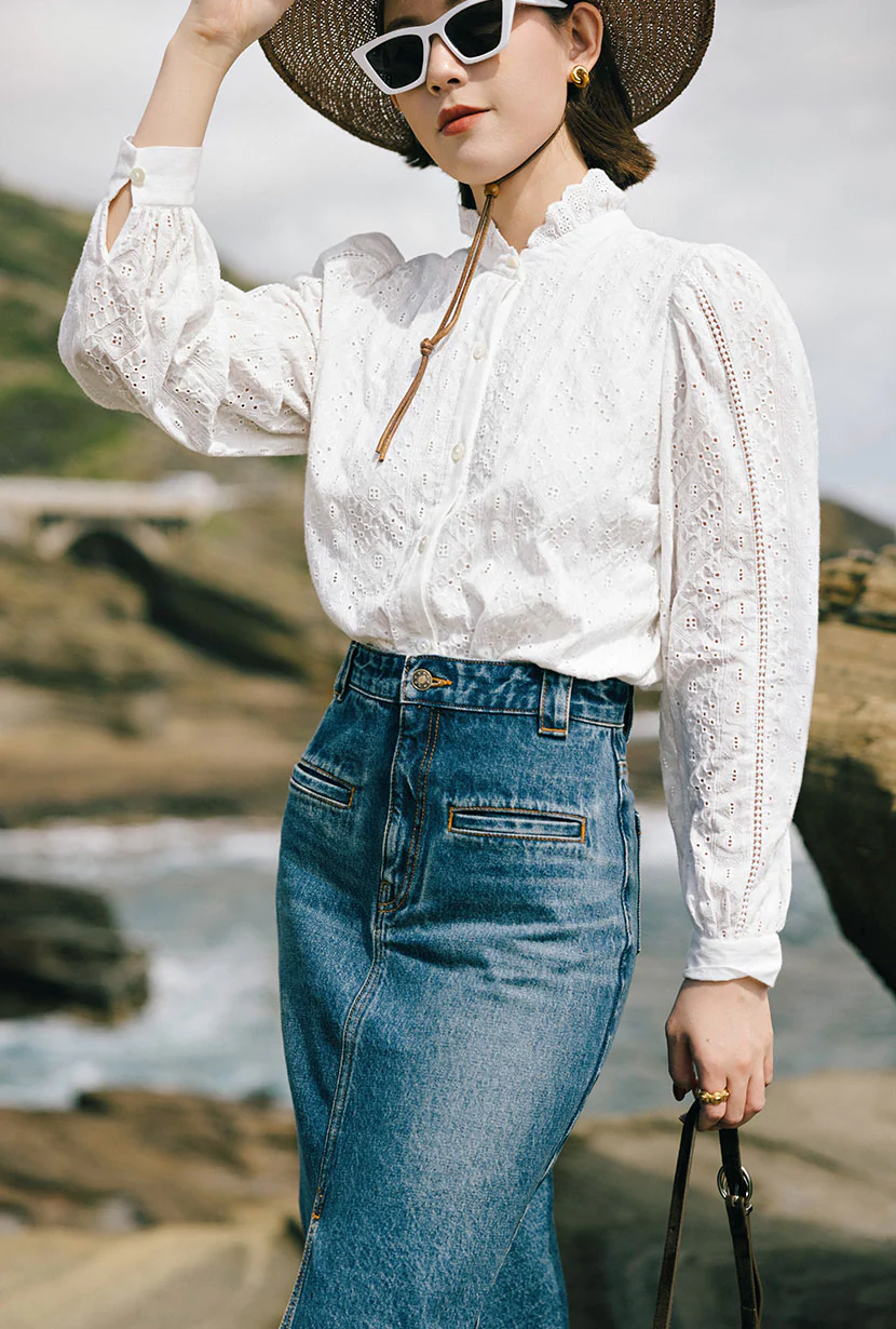 Description:A collaborative capsule collection with the modern muse @suggyl - Made from 100% cotton in classic ivory and cut for a slightly loose fit. It features a ruffled stand collar, curved hem, and long sleeves traced with crochet trims.